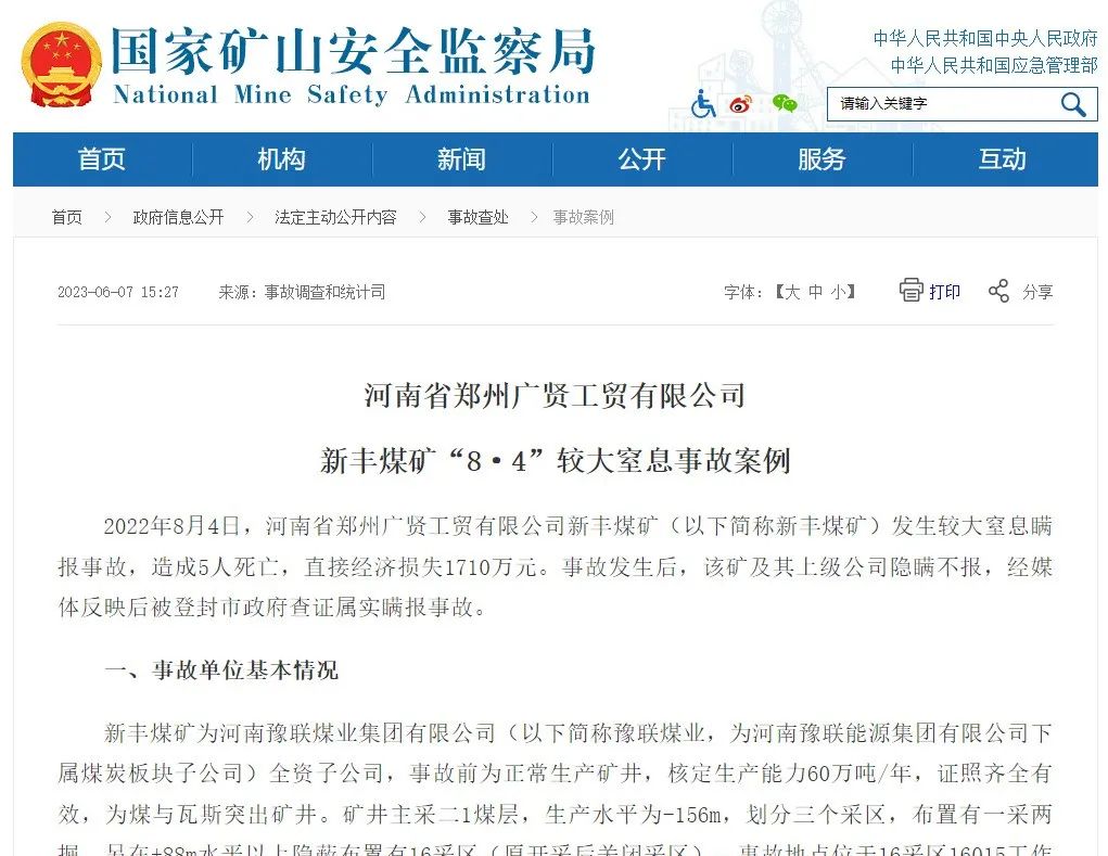 公告顯示,2022年8月4日,河南省鄭州廣賢工貿(mào)有限公司新豐煤礦(以下簡稱新豐煤礦)發(fā)生較大窒息瞞報事故,造成5人死亡,直接經(jīng)濟損失1710萬元。事故發(fā)生后,該礦及其上級公司隱瞞不報,經(jīng)媒體反映后被登封市政府查證屬實瞞報事故。