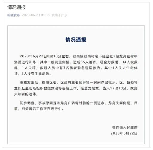 初步調(diào)查,事故原因是該龍舟在轉(zhuǎn)彎時船艙一側進水,龍舟失衡側翻。目前,相關善后工作正在進行中。