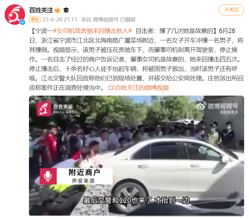 據(jù)媒體報道,6月28日,浙江省寧波市江北區(qū)北海南路廣廈菜場附近,一名女子開車沖撞一名男子,將其撞倒。視頻顯示,該男子被壓在奔馳車下,而肇事司機則離開駕駛室,停止操作。一名目擊了經(jīng)過的商戶告訴記者,肇事女司機是故意的,她來回撞擊四五次。停止撞擊后,十余名好心人徒手抬起車輛,將被困男子救出,當(dāng)時該男子還有呼吸。江北交警大隊回應(yīng)稱他們已到現(xiàn)場處置,并移交給公安局處理。莊橋派出所回應(yīng)稱案件正在調(diào)查處理當(dāng)中。