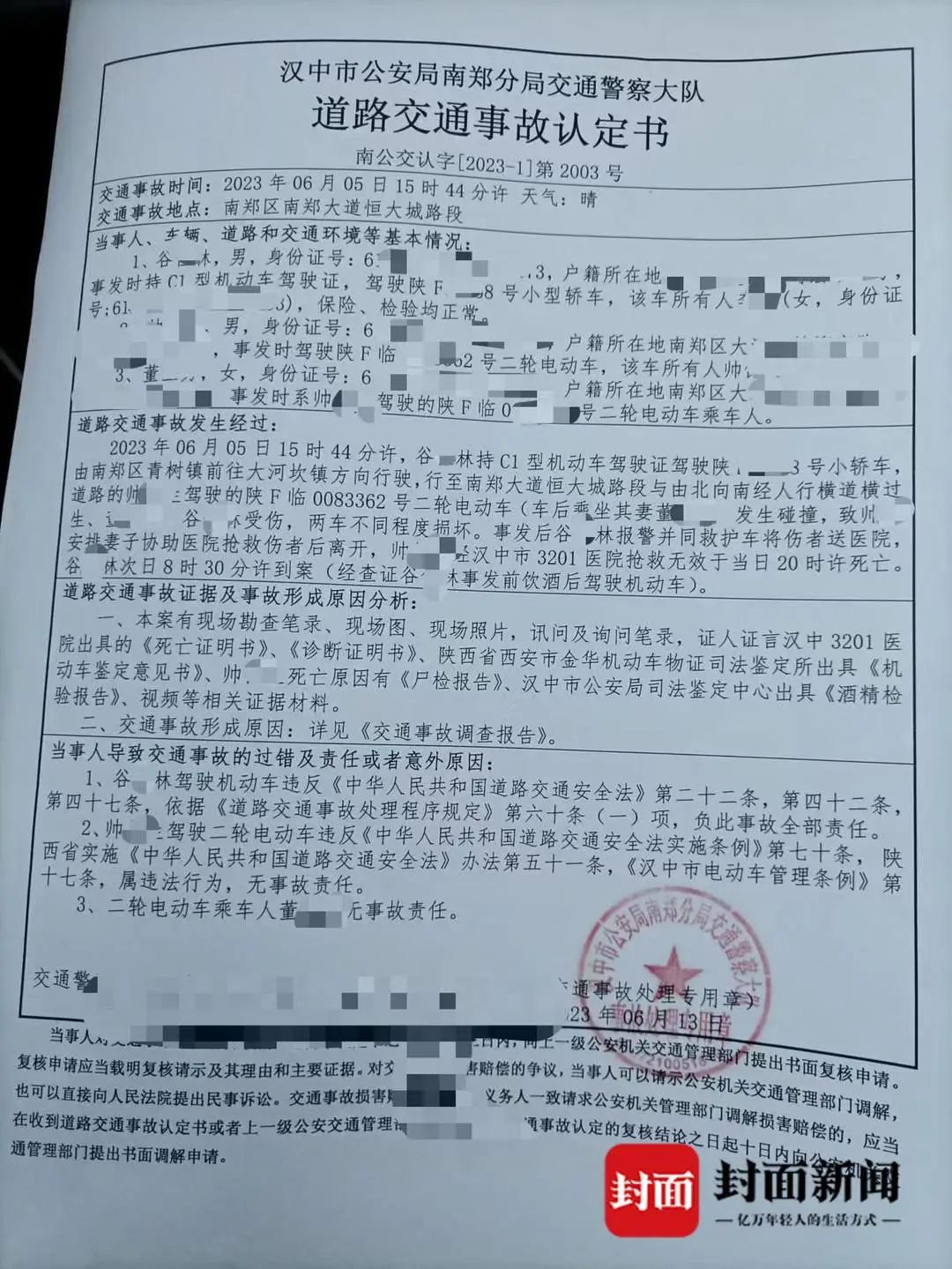 6月6日早上,帥先生從當(dāng)?shù)亟痪幜私獾?,事故次?時(shí)30分許,谷某林前往南鄭區(qū)公安局投案自首?!兜缆方煌ㄊ鹿收J(rèn)定書》顯示,經(jīng)查證谷某林事發(fā)前飲酒后駕駛機(jī)動(dòng)車。