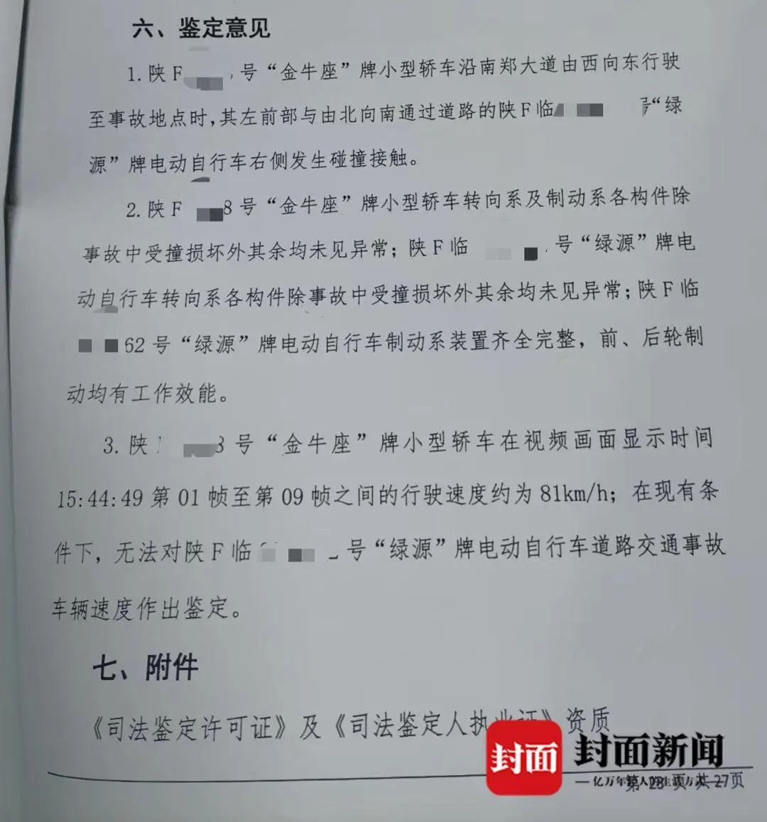 此外,帥先生提供的相關(guān)鑒定書顯示,陜西西安金華交通事故痕跡物證司法鑒定所出具了《司法鑒定意見書》,認(rèn)定事發(fā)當(dāng)日15時(shí)44分50秒時(shí),甲車左前部與乙車右側(cè)發(fā)生碰撞。鑒定意見顯示,視頻畫面顯示時(shí)間“15:44:49”的甲車行駛速度約為 81km/h。甲車是肇事司機(jī)谷某林駕駛的白色小型轎車。