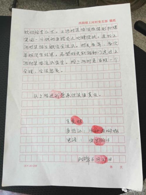 村民知道此事后,皆憤懣不平。十幾戶村民自發(fā)向縣市相關(guān)部門反映。但李紅衛(wèi)知道村民舉報(bào)后,從不正當(dāng)渠道得知村民信息,開始逐個(gè)威逼利誘。有的許諾可以安排到陽煤集團(tuán)工作;有的私下說和。市縣有關(guān)部門至今沒有任何處理結(jié)果,致使上河村集體財(cái)產(chǎn)流失。