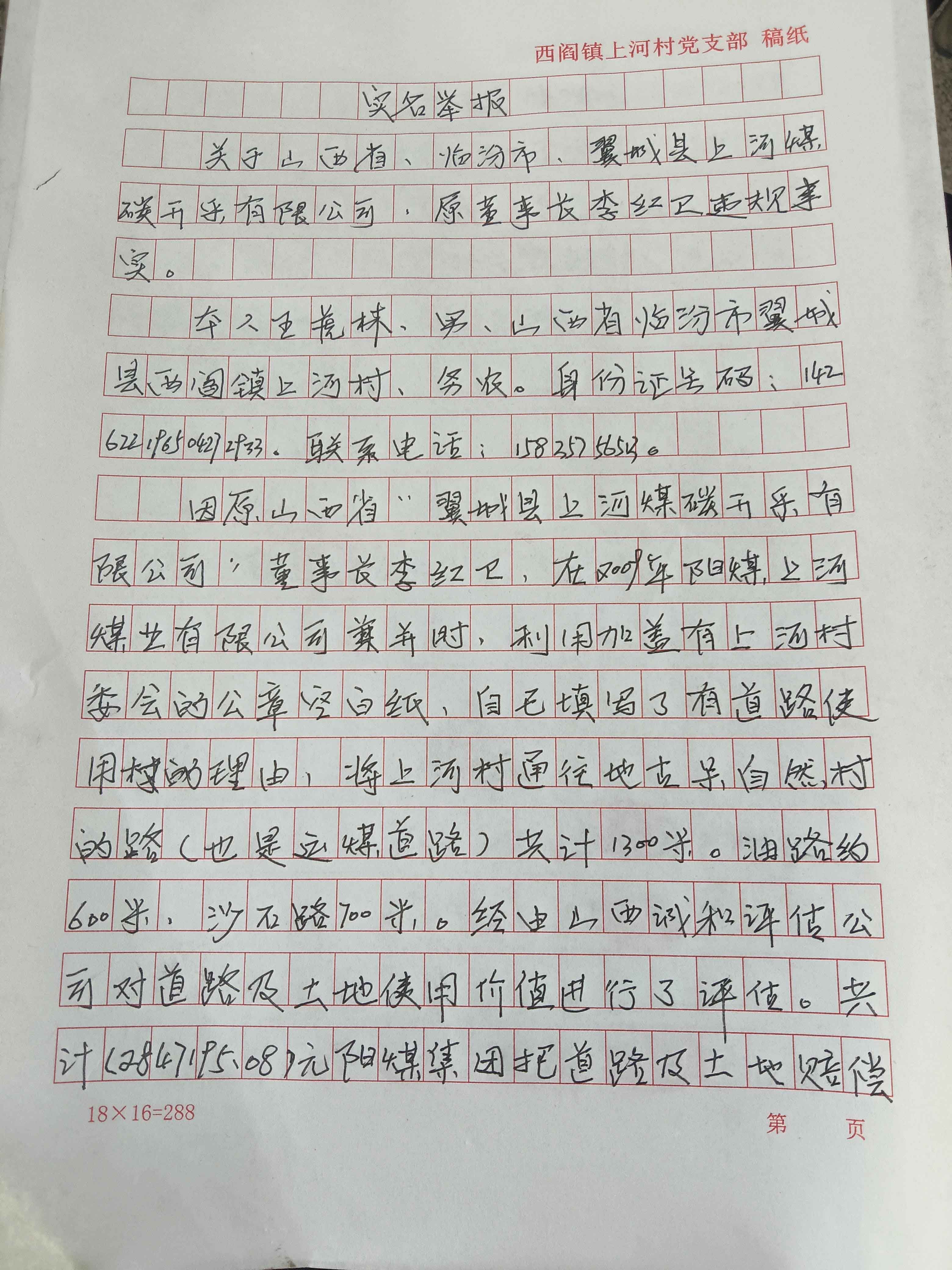 據(jù)村民實(shí)名舉報(bào),他們村(上河村)約1300米的公共道路,被李紅衛(wèi)(原上河煤炭開采有限公司董事長,現(xiàn)任陽煤集團(tuán)股東監(jiān)事會(huì),居住侯馬市),于2009年利用有加蓋上河村委公章的空白紙,填寫了道路使用權(quán),將上河村通往地古朵村的路賣給了陽煤集團(tuán),獲利金額約284萬元,占為己有。