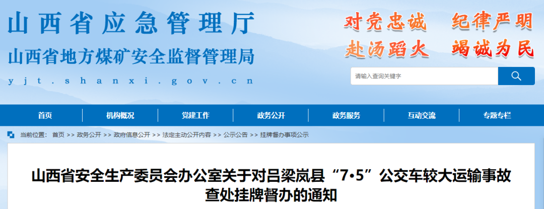 7月6日16時(shí),山西省安全生產(chǎn)委員會(huì)辦公室發(fā)布關(guān)于對(duì)呂梁嵐縣“7·5”公交車較大運(yùn)輸事故查處掛牌督辦的通知。根據(jù)《國務(wù)院關(guān)于進(jìn)一步加強(qiáng)企業(yè)安全生產(chǎn)工作的通知》和《山西省較大事故查處掛牌督辦辦法》等有關(guān)規(guī)定要求,山西省安委辦決定對(duì)該起事故查處實(shí)行掛牌督辦。
