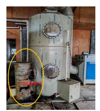 事故發(fā)生在腌制車(chē)間,該車(chē)間地上分為腌制池和倉(cāng)庫(kù)兩部分。倉(cāng)庫(kù)地下設(shè)有封閉式水解酸化池,將大分子污染物轉(zhuǎn)化為易于降解的小分子物質(zhì),酸化過(guò)程中會(huì)產(chǎn)生硫化氫等惡臭污染氣體。為了滿足污染物排放標(biāo)準(zhǔn),水解酸化池產(chǎn)生的惡臭氣體通過(guò)管道進(jìn)入車(chē)間內(nèi)的噴淋塔,再經(jīng)過(guò)光氧凈化和活性炭吸附裝置處理后排入大氣。
