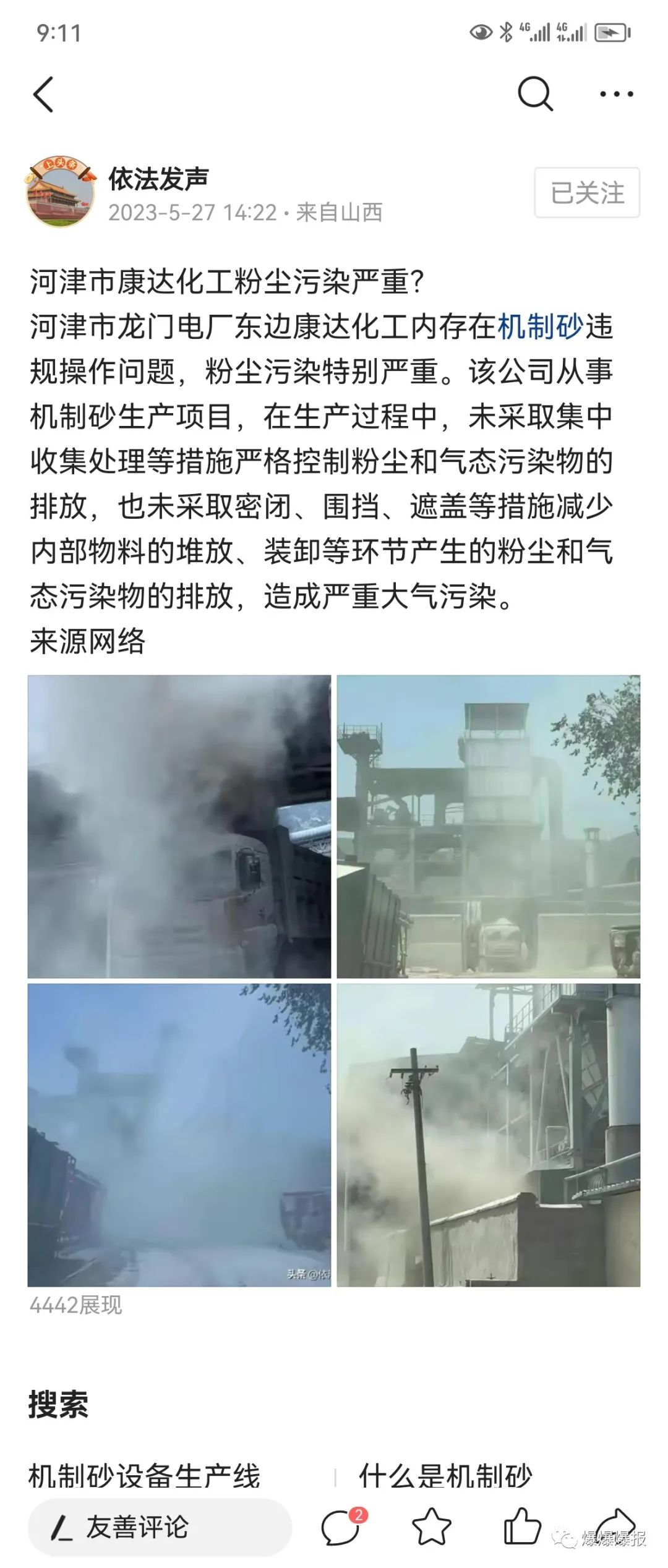 河津市龍門電廠東邊康達(dá)化工內(nèi)存在機(jī)制砂icon違規(guī)操作問題,粉塵污染特別嚴(yán)重。該公司從事機(jī)制砂生產(chǎn)項(xiàng)目,在生產(chǎn)過程中,未采取集中收集處理等措施嚴(yán)格控制粉塵和氣態(tài)污染物的排放,也未采取密閉、圍擋、遮蓋等措施減少內(nèi)部物料的堆放、裝卸等環(huán)節(jié)產(chǎn)生的粉塵和氣態(tài)污染物的排放,造成嚴(yán)重大氣污染。