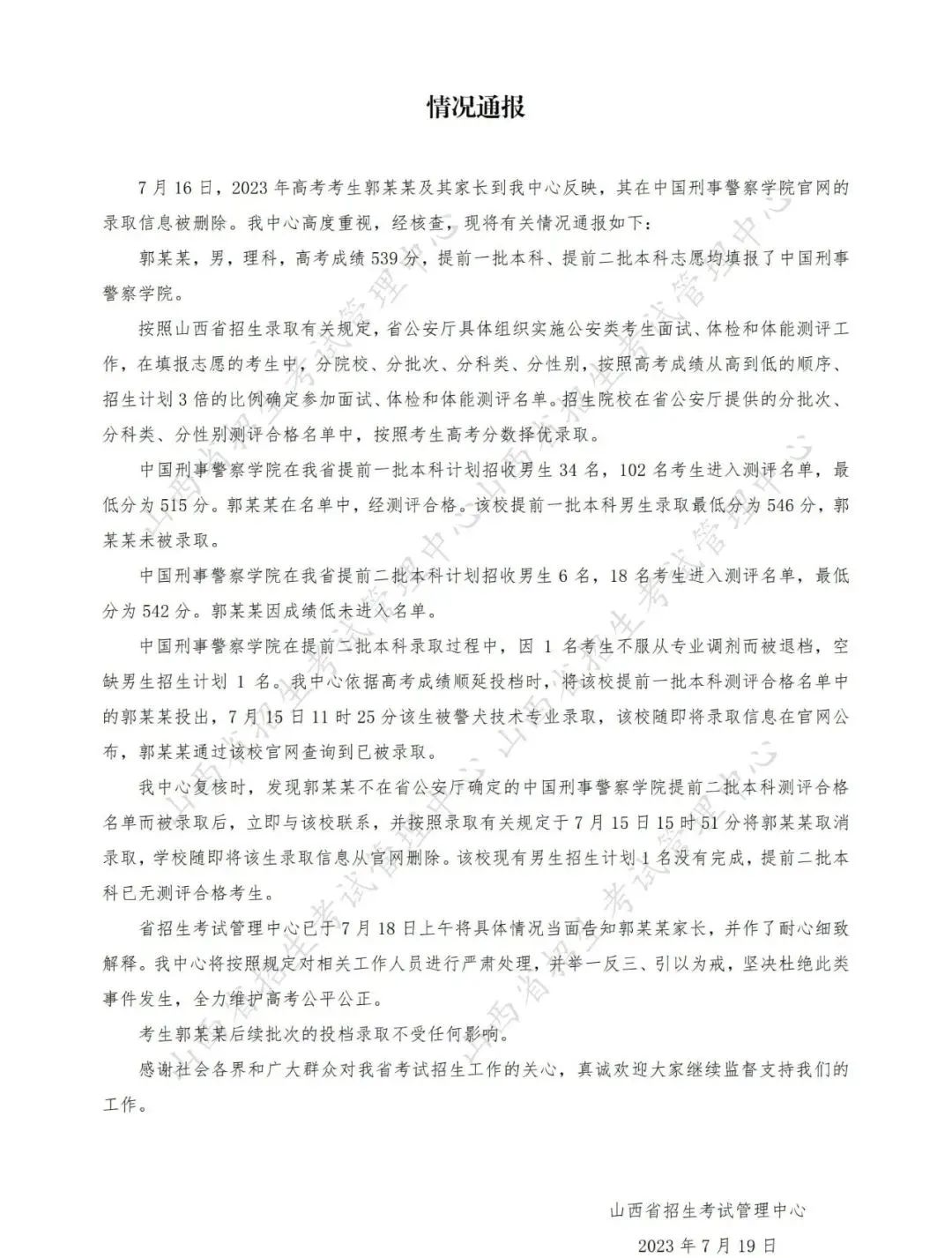 7月19日,山西省招生考試管理中心網(wǎng)站針對此事發(fā)布情況通報:7月16日,2023年高考考生郭某某及其家長到山西省招生考試管理中心反映,其在中國刑事警察學(xué)院官網(wǎng)的錄取信息被刪除。山西省招生考試管理中心高度重視,經(jīng)核查,現(xiàn)將有關(guān)情況通報如下:郭某某,男,理科,高考成績539分,提前一批本科、提前二批本科志愿均填報了中國刑事警察學(xué)院。按照山西省招生錄取有關(guān)規(guī)定,省公安廳具體組織實施公安類考生面試、體檢和體能測評工作,在填報志愿的考生中,分院校、分批次、分科類、分性別,按照高考成績從高到低的順序招生計劃3倍的比例確定參加面試、體檢和體能測評名單。招生院校在省公安廳提供的分批次、分科類、分性別測評合格名單中,按照考生高考分數(shù)擇優(yōu)錄取。中國刑事警察學(xué)院在山西省提前一批本科計劃招收男生34名,102名考生進入測評名單,最低分為515分。郭某某在名單中,經(jīng)測評合格。該校提前一批本科男生錄取最低分為546分,郭某某未被錄取。中國刑事警察學(xué)院在山西省提前二批本科計劃招收男生6名,18名考生進入測評名單,最低分為542分。郭某某因成績低未進入名單。中國刑事警察學(xué)院在提前二批本科錄取過程中,因1名考生不服從專業(yè)調(diào)劑而被退檔,空缺男生招生計劃1名。山西省招生考試管理中心依據(jù)高考成績順延投檔時,將該校提前一批本科測評合格名單中的郭某某投出,7月15日11時25分該生被警犬技術(shù)專業(yè)錄取,該校隨即將錄取信息在官網(wǎng)公布,郭某某通過該校官網(wǎng)查詢到已被錄取。山西省招生考試管理中心復(fù)核時,發(fā)現(xiàn)郭某某不在省公安廳確定的中國刑事警察學(xué)院提前二批本科測評合格名單而被錄取后,立即與該校聯(lián)系,并按照錄取有關(guān)規(guī)定于7月15日15時51分將郭某某取消錄取,學(xué)校隨即將該生錄取信息從官網(wǎng)刪除。該校現(xiàn)有男生招生計劃1名沒有完成,提前二批本科已無測評合格考生。山西省招生考試管理中心已于7月18日上午將具體情況當面告知郭某某家長,并作了耐心細致解釋。山西省招生考試管理中心將按照規(guī)定對相關(guān)工作人員進行嚴肅處理,并舉一反三、引以為戒,堅決杜絕此類事件發(fā)生,全力維護高考公平公正。考生郭某某后續(xù)批次的投檔錄取不受任何影響。