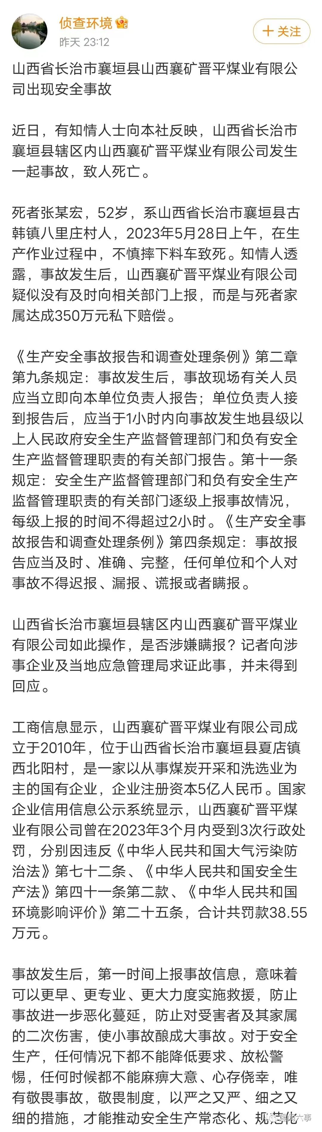 死者張某宏,52歲,系山西省長治市襄垣縣古韓鎮(zhèn)八里莊村人,2023年5月28日上午,在生產(chǎn)作業(yè)過程中,不慎摔下料車致死。知情人透露,事故發(fā)生后,山西襄礦晉平煤業(yè)有限公司疑似沒有及時向相關(guān)部門上報,而是與死者家屬達(dá)成350萬元私下賠償。