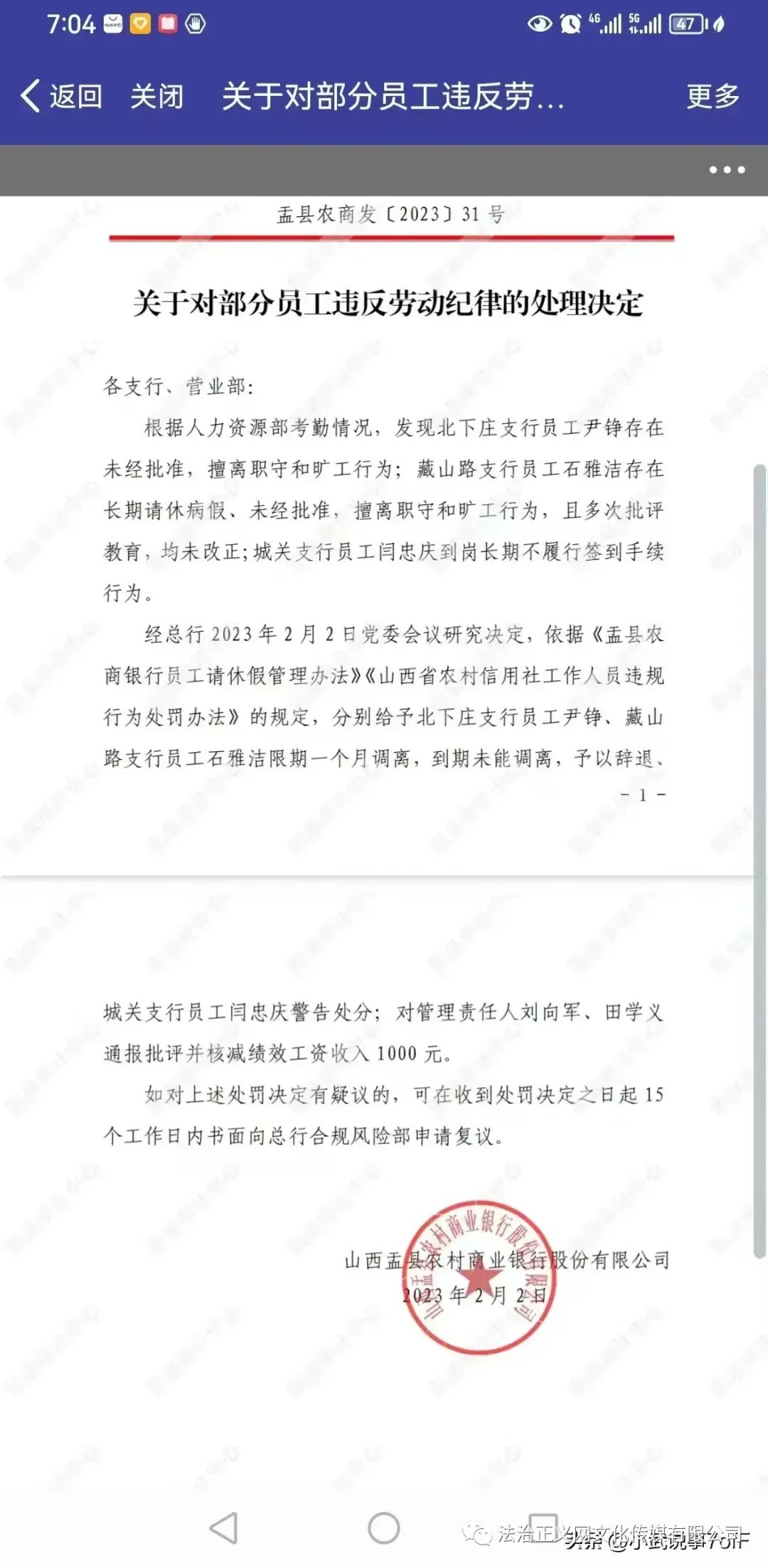 依據(jù)張女士提供的盂縣農(nóng)商發(fā)(2023)31號文件關(guān)于對部分員工違反勞動紀(jì)律的處理決定:經(jīng)總行2023年2月2日黨委會議研究決定,依據(jù)《盂縣農(nóng)商銀行員工請休假管理辦法》《山西省農(nóng)村信用社工作人員違規(guī)行為處罰辦法》的規(guī)定,分別給予北下莊支行員工尹錚、藏山路支行員工石雅潔限期一個月調(diào)離,到期未能調(diào)離,予以辭退。城關(guān)支行員工閆忠慶給予警告處分。