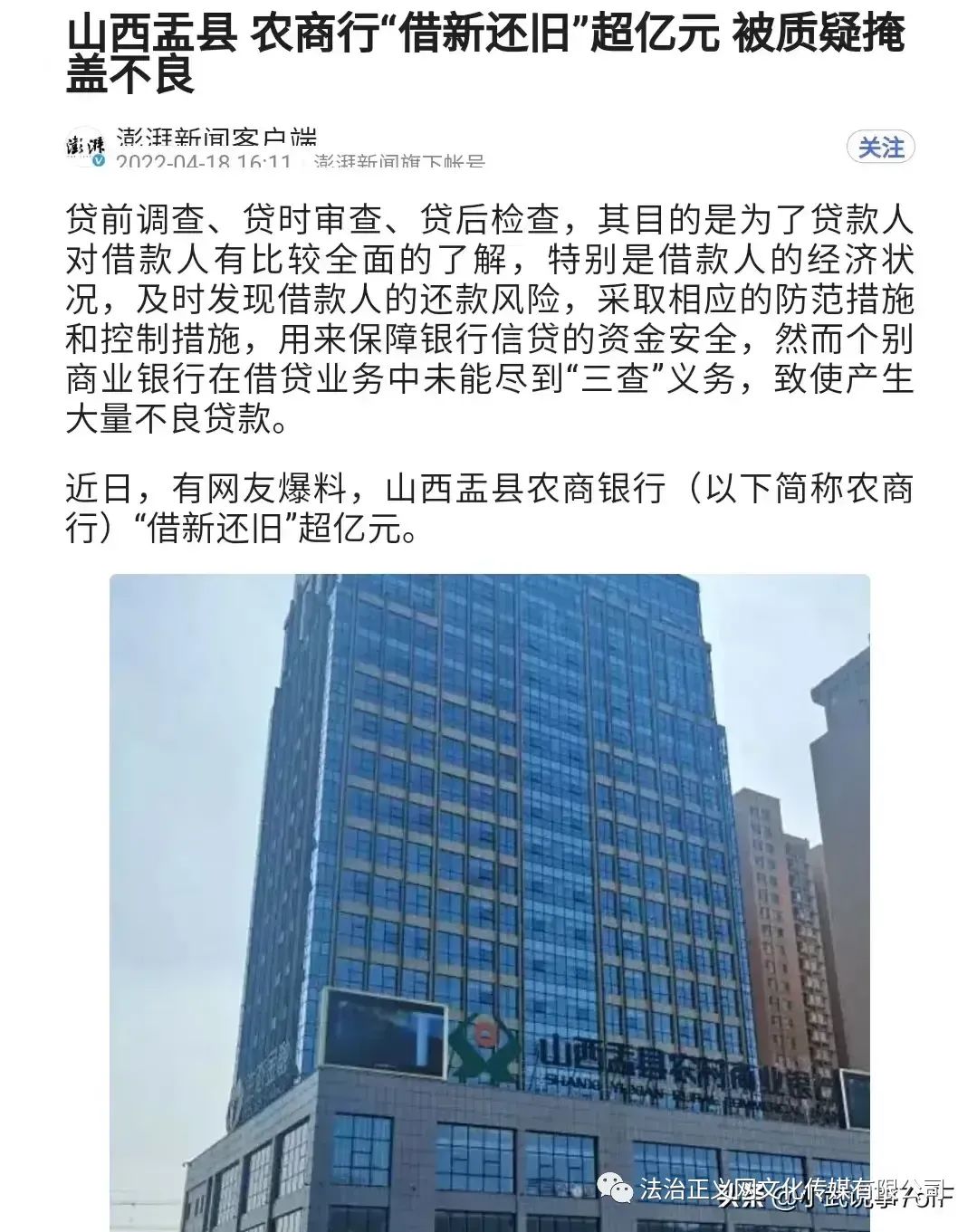 2022年4月18日,據(jù)澎湃新聞報道:山西盂縣農(nóng)商行“借新還舊”超億元,被質(zhì)疑掩蓋不良。2013年至2015年期間,農(nóng)商行與多家公司簽訂了《流動資金貸款合同》,貸款金額均在千萬元以上,用途為借新還舊。據(jù)顯示其中多家借貸公司多次成為失信被執(zhí)行人限制消費(fèi)。其貸款客戶在不能政策償還首次貸款本金及利息的前提下,以借新還舊的形式償還首次貸款,盂縣農(nóng)商行以借新還舊的形式來掩蓋首次貸款未還的不良情況,致使億元放貸資金存在風(fēng)險。