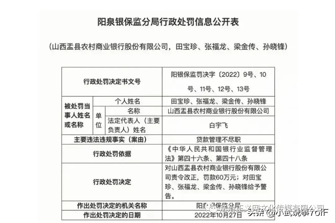 2022年11月2日,因貸款管理不盡職,陽泉銀保監(jiān)分局要求盂縣農(nóng)商行責(zé)令改正,并罰款60萬元;另外,對相關(guān)責(zé)任人田某珍、張某龍、梁某傳、孫某鋒給予警告。