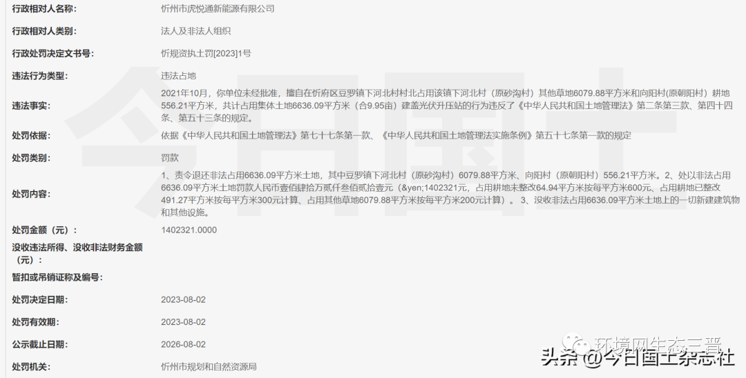 據(jù)山西省忻州市規(guī)劃和自然資源局8月2日公布的“忻規(guī)資執(zhí)土罰[2023]1號”行政處罰信息顯示,忻州市虎悅通新能源有限公司因非法占地建光伏升壓站,被處以罰款140.2321萬元。
