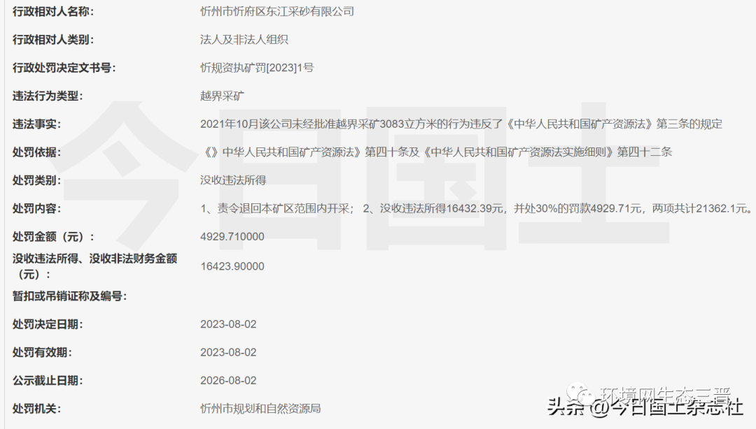 據(jù)山西省忻州市規(guī)劃和自然資源局8月2日公布的“忻規(guī)資執(zhí)礦罰[2023]1號”行政處罰信息顯示,忻州市忻府區(qū)東江采砂有限公司2021年10月未經(jīng)批準(zhǔn)越界采礦3083立方米的行為,違反了《中華人民共和國礦產(chǎn)資源法》第三條的規(guī)定。