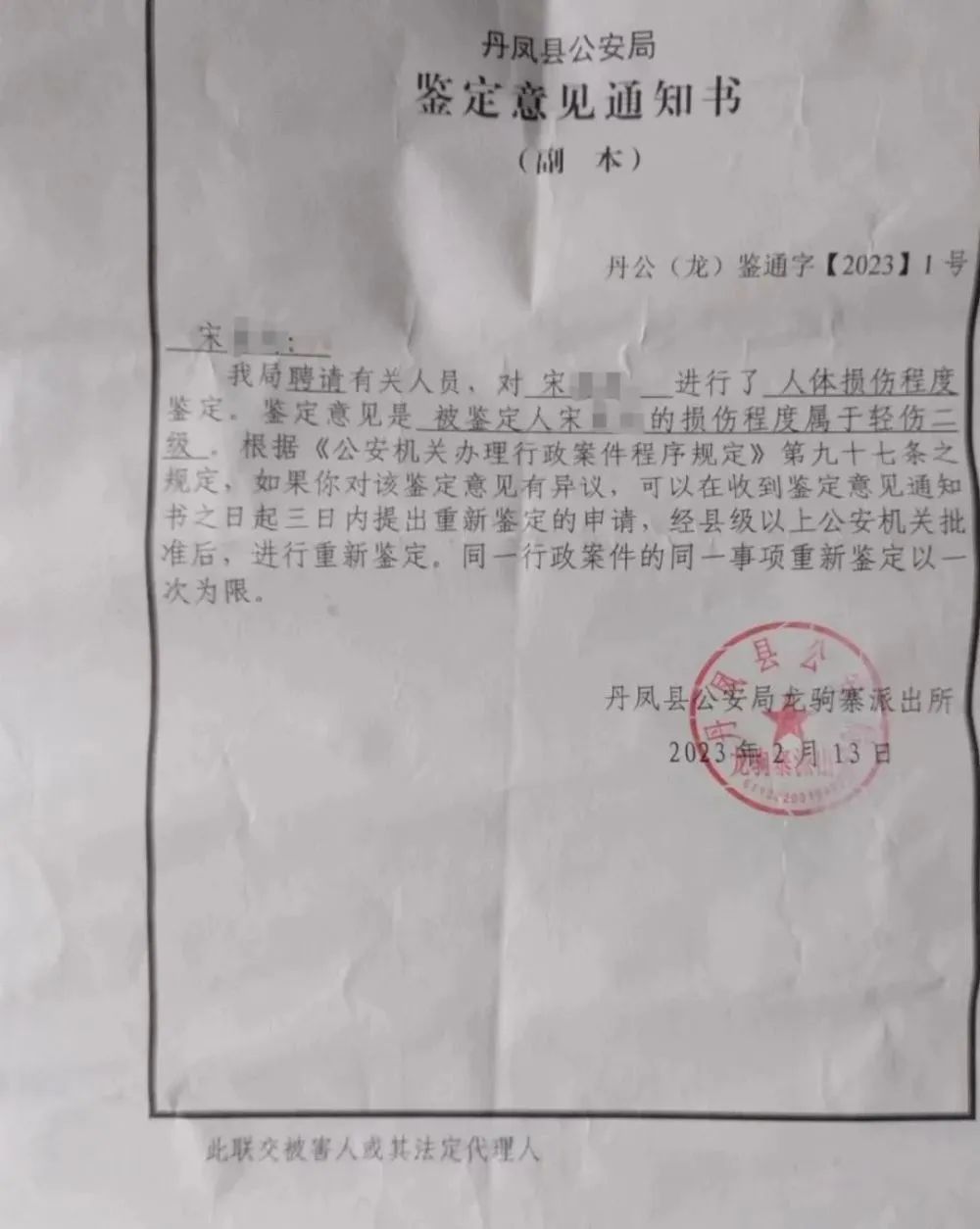 2023年2月13日,商洛市丹鳳縣公安局龍駒寨派出所向宋某出具了第一次傷情鑒定報(bào)告。宋某人體損傷程度屬于輕傷二級(jí)。