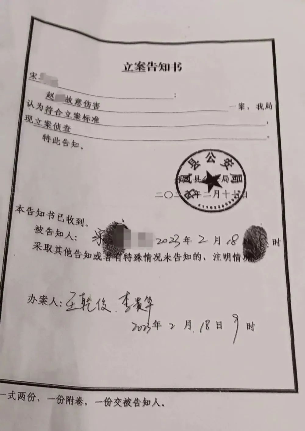 今年2月18日,宋某拿到了丹鳳縣公安局的立案告知書。“趙某故意傷害一案,我局認(rèn)為符合立案標(biāo)準(zhǔn),現(xiàn)立案?jìng)刹椤?/span>”