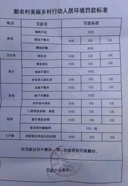 被子未疊放罰款10元、碗筷不洗罰款10元、蹲地用餐罰款20元。近期,四川省涼山彝族自治州普格縣一份加蓋了村委會公章的《新農(nóng)村美麗鄉(xiāng)村行動人居環(huán)境罰款標(biāo)準(zhǔn)》在網(wǎng)上流傳,并引發(fā)關(guān)注。