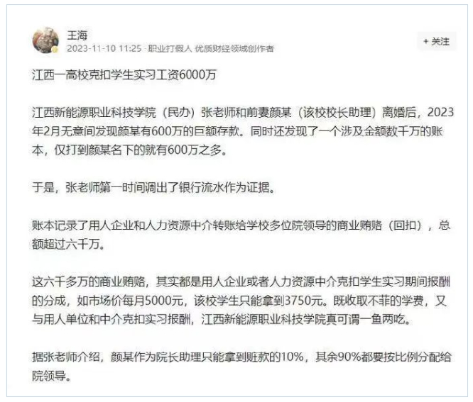 11月10日,知名打假人王海在網(wǎng)上發(fā)帖稱,江西新能源科技職業(yè)學院克扣學生實習報酬,金額達600萬元之巨,引發(fā)社會廣泛關(guān)注。
