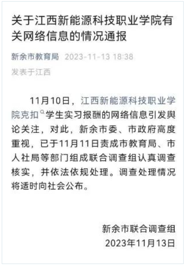 11月13日,江西省新余市教育局發(fā)布情況通報,稱新余市委、市政府對此事件高度重視,已責成新余市教育局、市人社局等部門組成聯(lián)合調(diào)查組認真調(diào)查核實,并依法依規(guī)處理。調(diào)查處理情況將適時向社會公布。