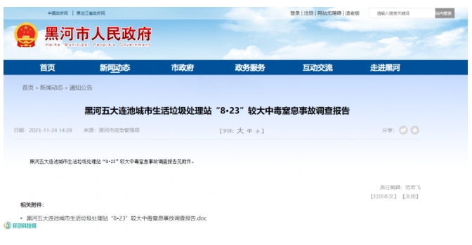 11月24日從黑河市人民政府網(wǎng)站獲悉,黑河市應急管理局公布了黑河五大連池城市生活垃圾處理站“8?23”較大中毒窒息事故調(diào)查報告。8月23日,五大連池市城市生活垃圾處理站在垃圾滲濾液抽取處理過程中1名工人不慎跌入臨時儲罐(有限空間),其他人員盲目施救,吸入過量有害氣體中毒窒息。事故造成4人死亡,直接經(jīng)濟損失297萬元(不含事故罰款)。