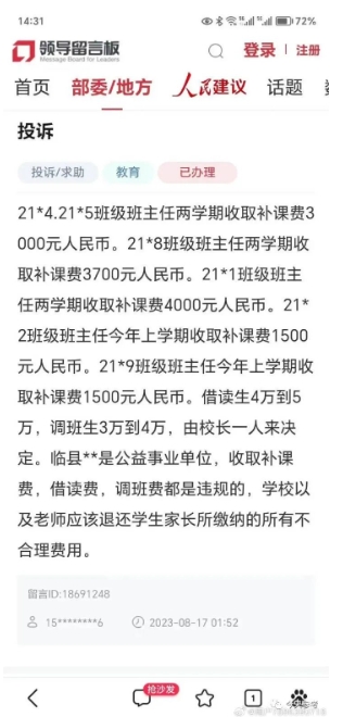 檢索發(fā)現(xiàn),2023年8月17日,有學(xué)生家長曾在人民網(wǎng)領(lǐng)導(dǎo)留言板向臨縣縣委書記留言稱:臨縣一中存在違規(guī)收取補(bǔ)課費(fèi),借讀生收4-5萬,調(diào)班生收3-4萬,由校長一人來決定。2023年9月14日,臨縣縣委辦回復(fù)稱,留言已收到,針對反映的問題,教育局工作人員已經(jīng)與舉報(bào)學(xué)生家長電話溝通。