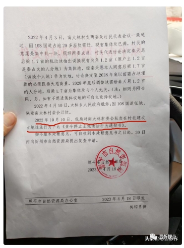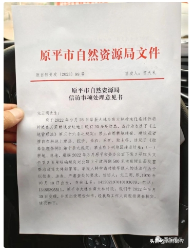村民提供的2023年4月18日,原平國(guó)土資源局給信訪人的答復(fù)【原平市自然資源局信訪事項(xiàng)處理意見書】原自然資發(fā) (2023)99號(hào)文件顯示,于2022年9月28舉報(bào)至原平市自然資源局,9月30日接受并受理。2022年10月10日,我局對(duì)南大林村委會(huì)私自在村北建墳占地違法行為下達(dá)《責(zé)令停止土地違法行為通知書》。