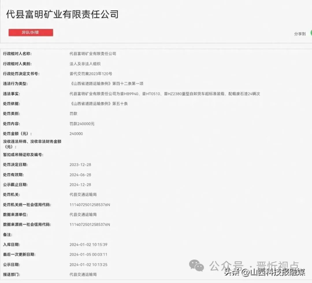 近日,國家企業(yè)信用信息公示系統(tǒng)顯示,代縣富明礦業(yè)有限責(zé)任公司,新增一條行政處罰,處罰文書號(hào)為,“晉代交罰案2023年120號(hào)”,罰款金額為24萬元,處罰事由是違反《山西省道路運(yùn)輸條例》相關(guān)條款,為車輛超標(biāo)準(zhǔn)裝載配載廢石渣,處罰單位為代縣交通運(yùn)輸局。