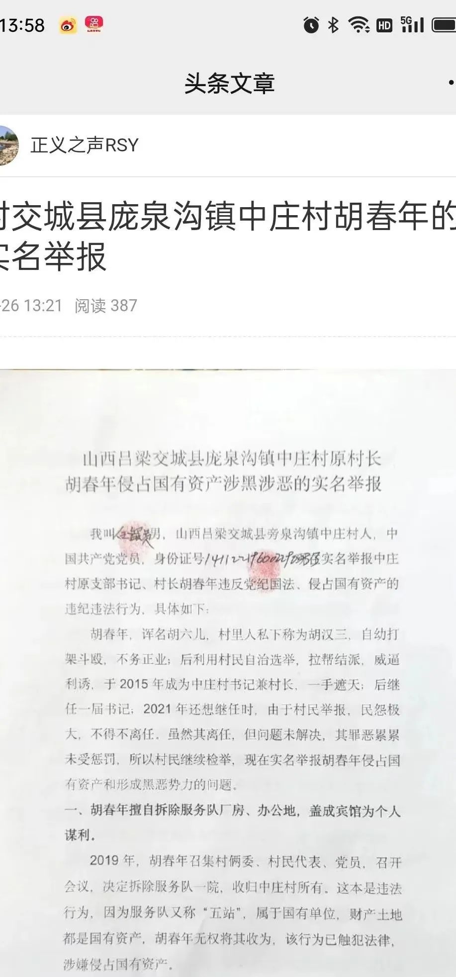 胡春年,諢名胡六兒,村里人私下稱為胡漢三,自幼打架斗毆,不務(wù)正業(yè);后利用村民自治選舉,拉幫結(jié)派,威逼利誘,于2015年成為中莊村書記兼村長,一手遮天;后繼任一屆書記;2021年還想繼任時,由于村民舉報,民怨極大,不得不離任。雖然其離任,但問題未解決,其罪惡累累未受懲罰,所以村民繼續(xù)檢舉,現(xiàn)在實名舉報胡春年侵占國有資產(chǎn)和形成黑惡勢力的問題。