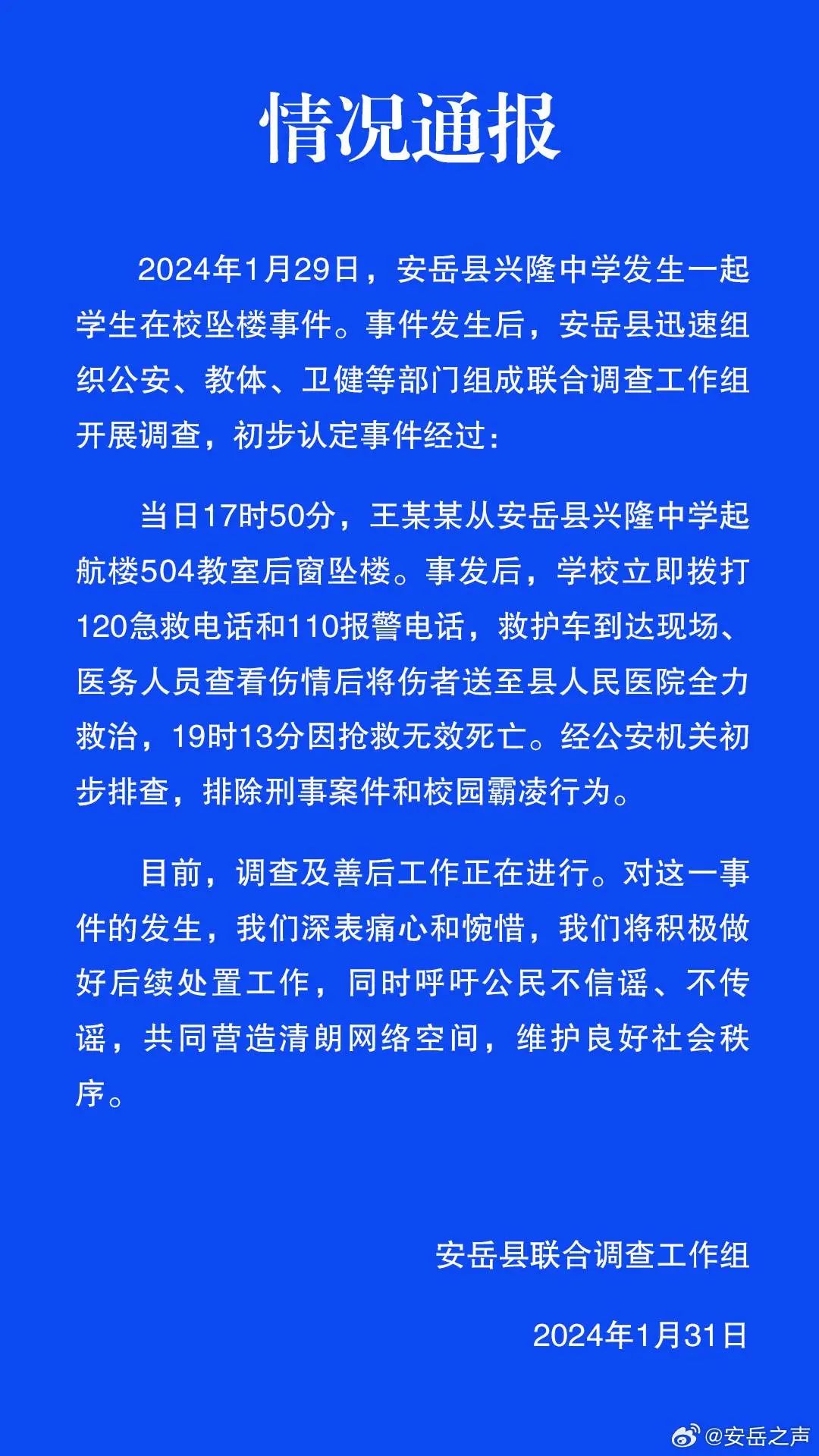1月31日,據(jù)安岳之聲消息:2024年1月29日,安岳縣興隆中學發(fā)生一起學生在校墜樓事件。事件發(fā)生后,安岳縣迅速組織公安、教體、衛(wèi)健等部門組成聯(lián)合調(diào)查工作組開展調(diào)查,初步認定事件經(jīng)過:當日17時50分,王某某從安岳縣興隆中學起航樓504教室后窗墜樓。事發(fā)后,學校立即撥打120急救電話和110報警電話,救護車到達現(xiàn)場、醫(yī)務人員查看傷情后將傷者送至安岳縣人民醫(yī)院全力救治,19時13分因搶救無效死亡。經(jīng)公安機關初步排查,排除刑事案件和校園霸凌行為。