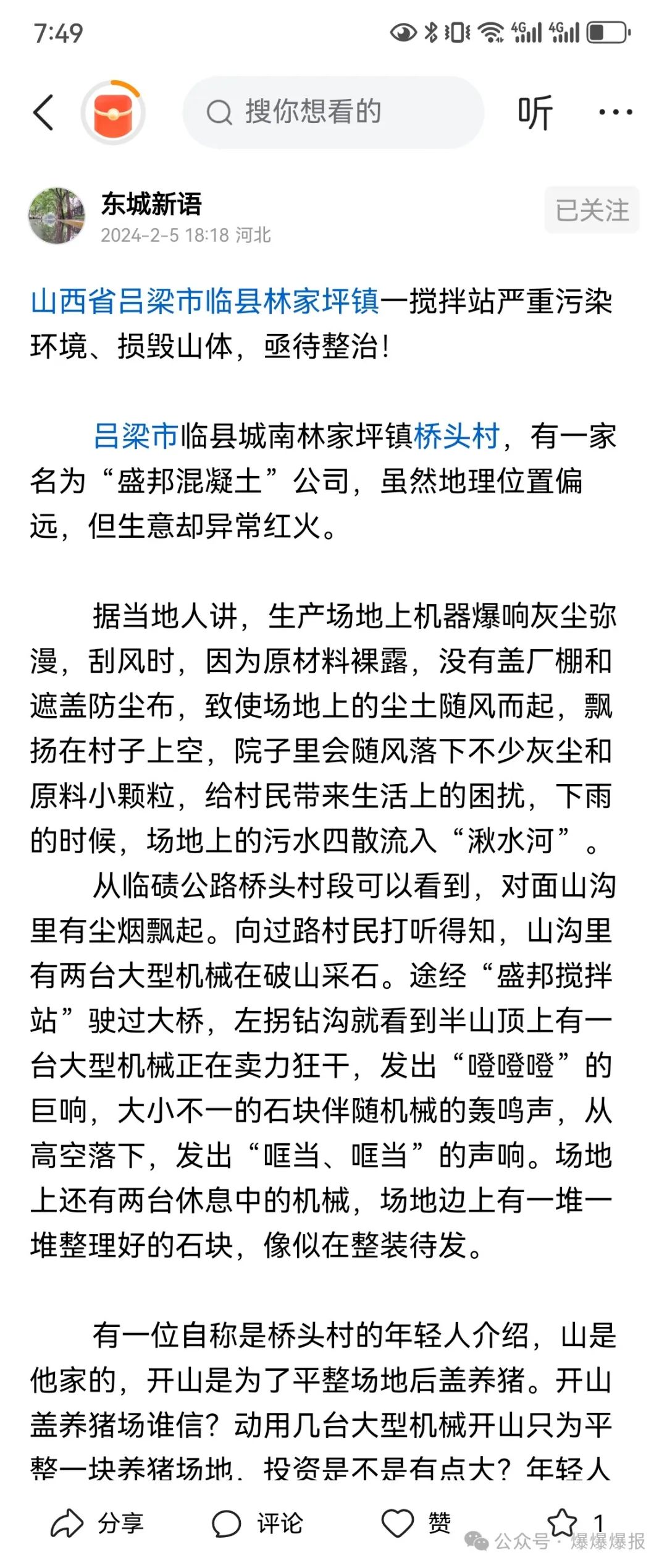 離開現(xiàn)場后,隨即向林家坪相關(guān)部門致電反映此事。一位領(lǐng)導(dǎo)表示:“早就不讓他干了,反映情況知道了,我們會調(diào)查?!比欢鴷r至今日發(fā)稿未收到任何回復(fù)。如此的兩家場地大肆污染環(huán)境破壞山體,相關(guān)部門是不是該給他們普及一下“土地和環(huán)?!狈?!