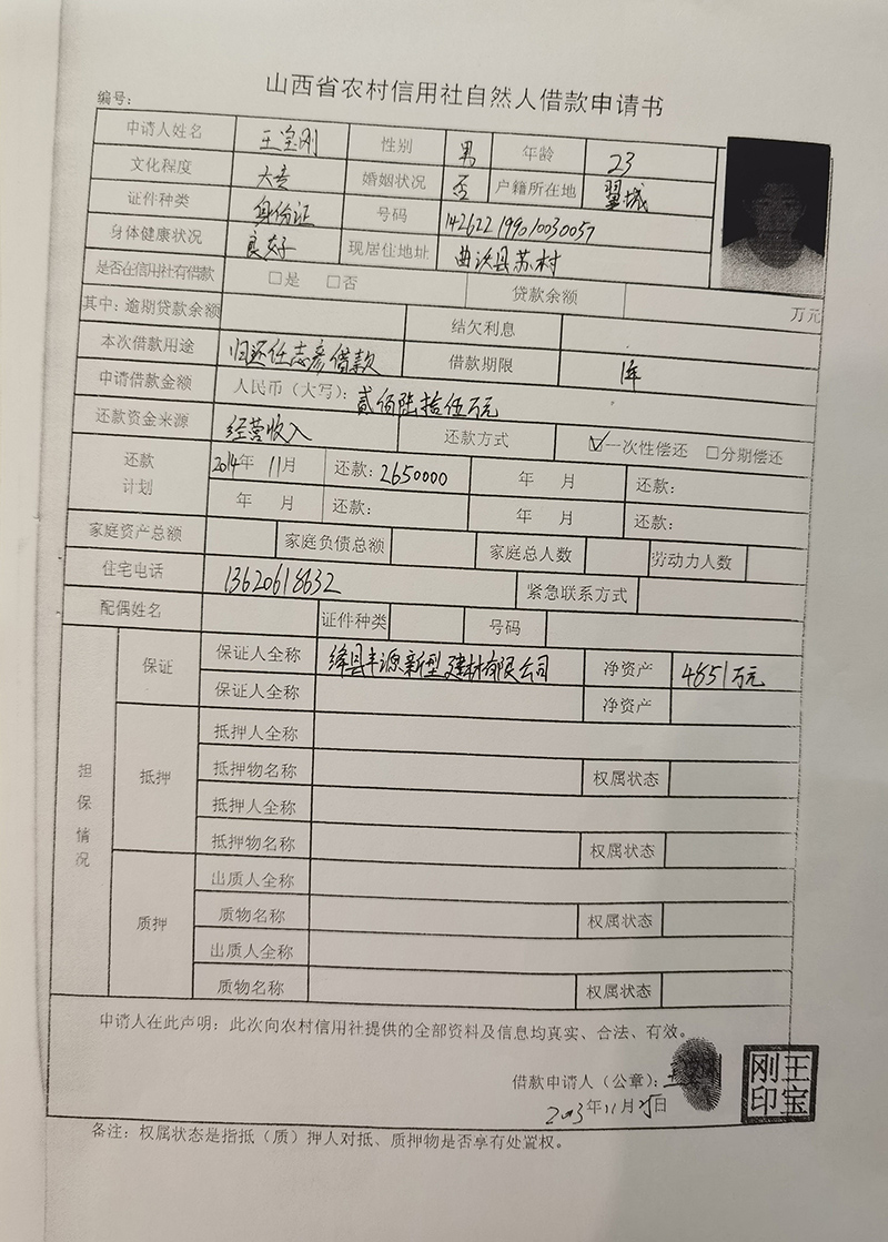265萬貸款是2013年王寶剛為歸還任志彥借款,向曲沃北董信用社申請貸款265萬,還款來源明確寫明由億豐洗煤有限公司的年利潤歸還,借款期限一年(白紙黑字寫的清清楚楚),王寶剛這筆借款當時由其父王清福擔任法人的豐源建材公司做擔保。