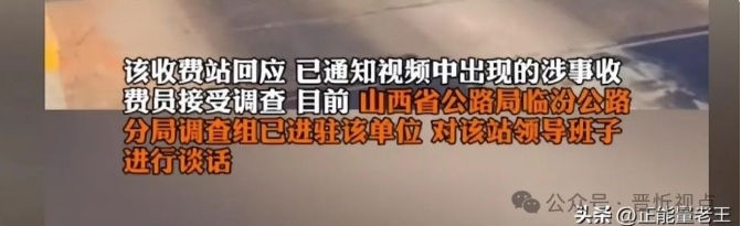 該收費(fèi)站回應(yīng)稱(chēng):已通知視頻中出現(xiàn)的涉事收費(fèi)員接受調(diào)查,目前山西省公路局臨汾公路分局調(diào)查組已進(jìn)駐該單位,對(duì)該站領(lǐng)導(dǎo)班子進(jìn)行談話(huà)。