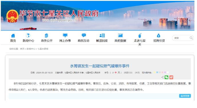 據(jù)畢節(jié)市七星關(guān)區(qū)政府網(wǎng)站消息,5月18日22時(shí)50分許,七星關(guān)區(qū)水箐鎮(zhèn)發(fā)生一起疑似燃?xì)夤薇ㄊ录?。事發(fā)后,應(yīng)急、公安、消防、市場(chǎng)監(jiān)管、住建、工信等相關(guān)部門迅速前往處置救援。事件導(dǎo)致2人死亡,4人受傷,傷者已送醫(yī)救治,暫無生命危險(xiǎn)。目前,相關(guān)部門正在進(jìn)行后續(xù)處置,事發(fā)原因正在調(diào)查中。