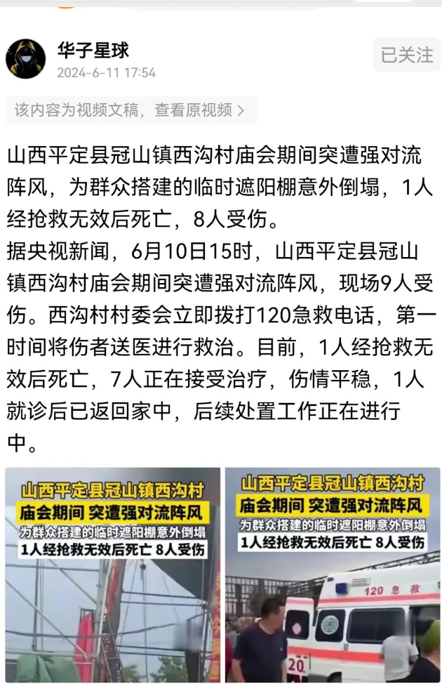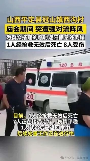山西平定縣冠山鎮(zhèn)西溝村廟會(huì)期間突遭強(qiáng)對(duì)流陣風(fēng),為群眾搭建的臨時(shí)遮陽(yáng)棚意外倒塌,1人經(jīng)搶救無(wú)效后死亡,8人受傷。