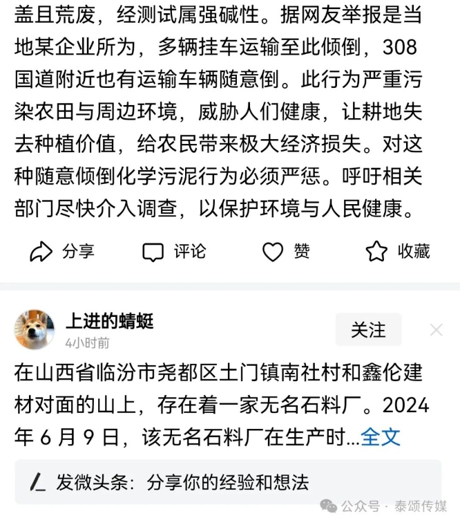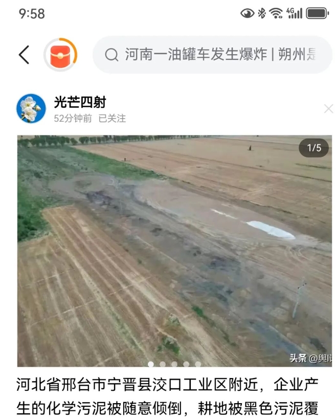 耕地被黑色污泥覆蓋且荒廢,經(jīng)測(cè)試屬強(qiáng)堿性。據(jù)網(wǎng)友舉報(bào)是當(dāng)?shù)啬称髽I(yè)所為,多輛掛車運(yùn)輸至此傾倒,308 國道附近也有運(yùn)輸車輛隨意倒。此行為嚴(yán)重污染農(nóng)田與周邊環(huán)境,威脅人們健康,讓耕地失去種植價(jià)值,給農(nóng)民帶來極大經(jīng)濟(jì)損失。對(duì)這種隨意傾倒化學(xué)污泥行為必須嚴(yán)懲。呼吁相關(guān)部門盡快介入調(diào)查,以保護(hù)環(huán)境與人民健康。