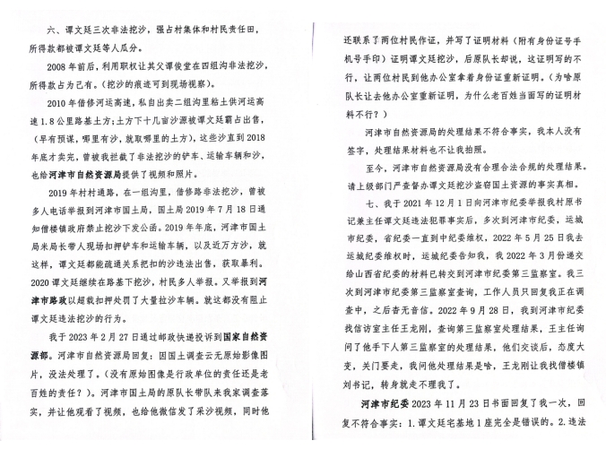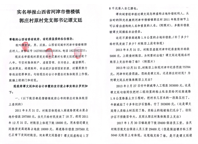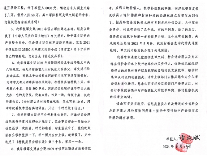 8、我舉報(bào)譚某廷在分配2009年修河運(yùn)高速占地補(bǔ)償款中,虛構(gòu)占地補(bǔ)償人,私吞補(bǔ)償款的事情,河津紀(jì)委回復(fù)我說核實(shí)占地補(bǔ)償款和村民種植的經(jīng)濟(jì)林清點(diǎn)后都發(fā)放到位了。但是事實(shí)是村民根本沒有見到占地補(bǔ)償公示,具體定價(jià)是多少,村民有的領(lǐng)了幾千元,有的不同意,給了兩三萬,最終老百姓就不知道一畝補(bǔ)償多少錢,至今沒有社保費(fèi),失地保險(xiǎn)。還是我2022年5月份,找到村委會(huì)查詢我的失地保險(xiǎn)時(shí),譚某廷才給村民辦理了失地保險(xiǎn)。