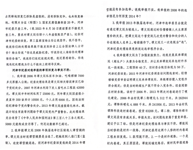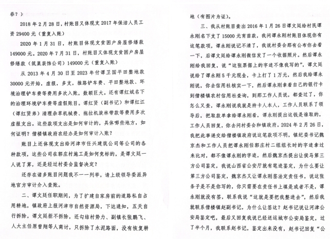 4.我舉報(bào)譚某廷為了加強(qiáng)家族勢(shì)力,違規(guī)發(fā)展其弟譚效某(超生戶)夫妻為合格黨員、并讓其弟譚效某承包村外東北一段道路,工程預(yù)標(biāo)40萬,但村委會(huì)賬目體現(xiàn)為50萬,河津紀(jì)委回復(fù):2015年河津市紀(jì)委調(diào)查該問題線索時(shí),經(jīng)僧樓鎮(zhèn)黨委審查證明譚某廷弟弟譚效某、弟媳譚某霞入黨程序符合規(guī)定;但是當(dāng)時(shí)的超生戶就不符合入黨條件。經(jīng)查閱郭莊村財(cái)務(wù)賬,該村于2006年、2013年兩次對(duì)巷道進(jìn)行了硬化建設(shè),2006年由村民譚二某硬化5.312千米,共262944元;譚某科硬化4.888千米,共241956元。2013年由村民譚某科改造村南巷道,投資83208元。譚二某、譚某科都與譚某廷沒有親戚關(guān)系,舉報(bào)失實(shí)。該問題線索屬于重復(fù)舉報(bào),建議予以了結(jié)。但是河津紀(jì)委處理結(jié)果與事實(shí)不符,譚效某當(dāng)時(shí)修的是村外一段路,河津紀(jì)委用這兩個(gè)人修的村內(nèi)巷道工程來回復(fù)我,1.款項(xiàng)就不符,2.一個(gè)是村外道路,一個(gè)是村內(nèi)巷道,真正原因是,譚效某鋪完路后,被村民舉報(bào)道路是豆腐渣工程,給了舉報(bào)人8000元,鎮(zhèn)政府來人調(diào)查又給了幾萬,最后入賬50萬。其中譚某科還是譚某廷爸的親家,這能說沒有親戚關(guān)系嗎?