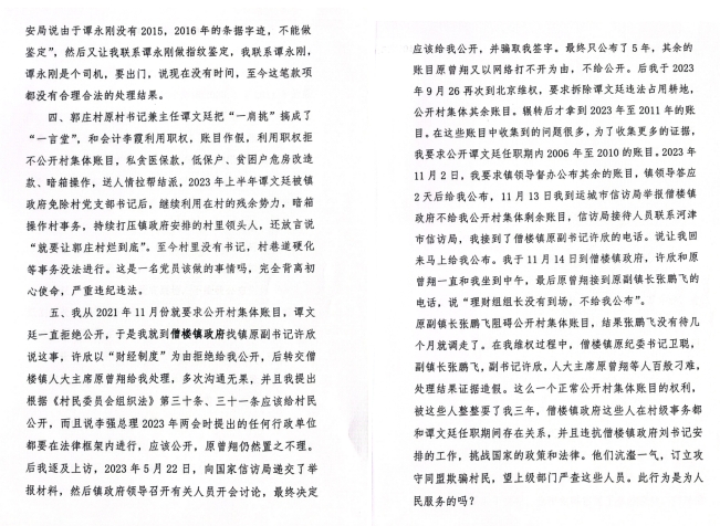 我要求依法依紀(jì)依規(guī)徹查譚某廷、村會(huì)計(jì)李某霞以及為其撐當(dāng)保護(hù)傘的各上級(jí)行政單位相關(guān)責(zé)任人,依法依紀(jì)依規(guī)歸還侵占的村集體財(cái)產(chǎn)以及截留的各項(xiàng)村民發(fā)放款等,賠償村集體及村民的利益損失。請(qǐng)求上級(jí)部門安排異地官方介入審查我村集體賬目。懇求山西省紀(jì)檢監(jiān)察部門嚴(yán)查譚某廷、村會(huì)計(jì)李某霞侵吞集體財(cái)產(chǎn)數(shù)額巨大的犯罪事實(shí),移送檢察機(jī)關(guān)依法審查起訴。