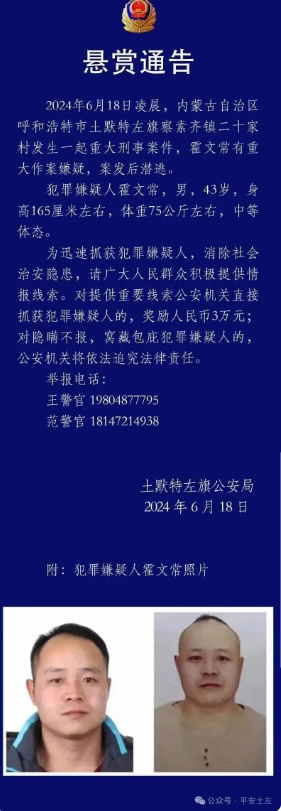 警方通告顯示,犯罪嫌疑人霍文常,男,43歲,身高165厘米左右,體重75公斤左右,中等體態(tài)。
