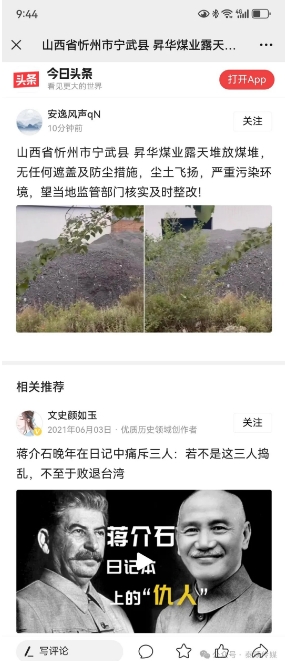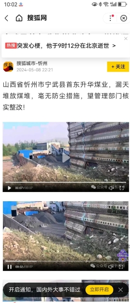 山西省忻州市寧武縣 昇華煤業(yè)露天堆放煤堆,無任何遮蓋及防塵措施,塵土飛揚(yáng),嚴(yán)重污染環(huán)境,望當(dāng)?shù)乇O(jiān)管部門核實(shí)及時整改!