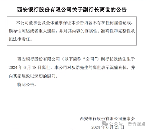 6月21日,西安銀行公告,副行長(zhǎng)狄浩于2024年6月18日離世。本公司對(duì)狄浩的離世表示沉痛哀悼,并向其家屬致以深切的慰問。