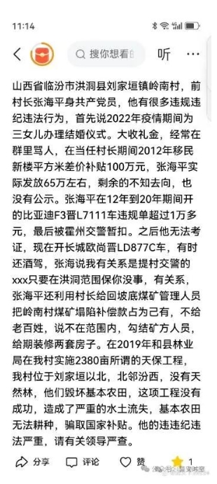 山西省臨汾市洪洞縣劉家垣鎮(zhèn)嶺南村,前村長張海平身共產(chǎn)黨員,他有很多違規(guī)違紀(jì)違法行為,首先說2022年疫情期間為三女兒辦理結(jié)婚儀式。大收禮金,經(jīng)常在群里罵人,在當(dāng)任村長期間2012年移民新樓平方米差價補貼100萬元,張海平實際發(fā)放65萬左右,剩余的不知去向,也沒有公示。