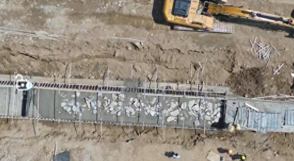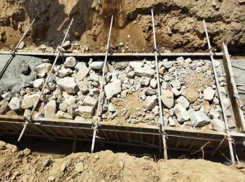 據(jù)了解,片石混凝土的標(biāo)準(zhǔn)配比應(yīng)為石頭占25%,砼占75%,按照施工工藝,打混凝土的同時應(yīng)該人工拋石,但現(xiàn)場發(fā)現(xiàn)各標(biāo)段都是用大型挖機(jī)連土帶石頭一起挖入混凝土中!且在施工過程中應(yīng)確保石頭與砼的均勻混合。然而,據(jù)現(xiàn)場觀察實(shí)際施工過程中石頭的比例遠(yuǎn)超過標(biāo)準(zhǔn), 這種不規(guī)范的施工行為不僅違反了相關(guān)技術(shù)規(guī)范,也可能對工程質(zhì)量和安全造成嚴(yán)重威脅。