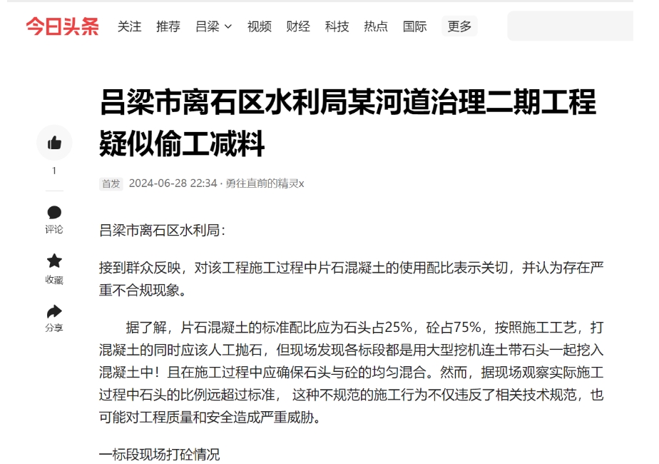 接到群眾反映,對該工程施工過程中片石混凝土的使用配比表示關(guān)切,并認(rèn)為存在嚴(yán)重不合規(guī)現(xiàn)象。