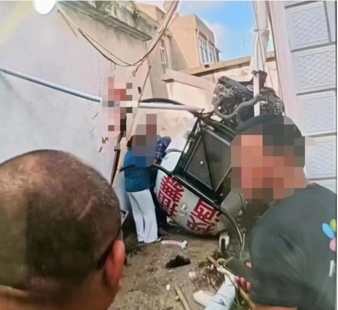 事發(fā)現(xiàn)場的照片顯示,一架飛行器卡在兩間民房之間。