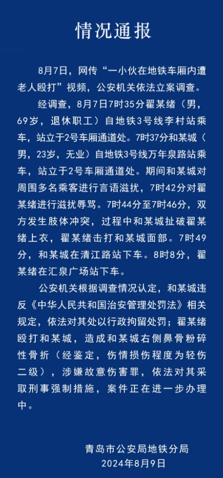 8月9日,“青島地鐵公安”微信公眾號(hào)發(fā)布情況通報(bào),全文如下↓
