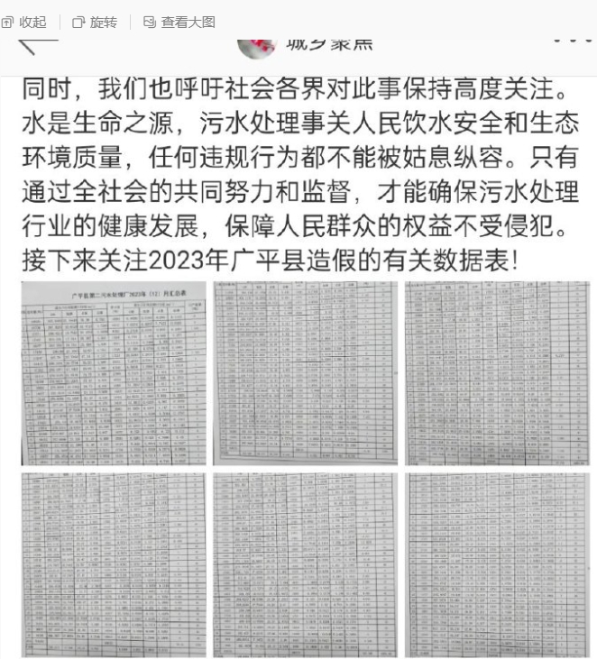 然而,通過(guò)現(xiàn)場(chǎng)觀看我們發(fā)現(xiàn),廣平縣污水處理廠在加注自來(lái)水的過(guò)程中并沒(méi)有進(jìn)行以上準(zhǔn)備工作,他們采取“大水漫灌”的加水方式,隨意向排污設(shè)備中注入自來(lái)水,這種做法不僅無(wú)法有效稀釋水中雜質(zhì),反而造成了水資源浪費(fèi)和檢測(cè)結(jié)果失真。更令人疑惑的是該廠2023年全年的進(jìn)、出水?dāng)?shù)據(jù)統(tǒng)計(jì)表,通過(guò)這份數(shù)據(jù),我們可以很直觀的了解到污水處理廠內(nèi)部的運(yùn)作情況,統(tǒng)計(jì)表中所標(biāo)注的數(shù)據(jù)顯示,廣平縣第二污水處理廠在2023年的污水處理過(guò)程中,疑似存在嚴(yán)重的違規(guī)行為,可就是這樣一份數(shù)據(jù)表居然通過(guò)了相關(guān)部門的審核,作為廣平縣污水處理廠應(yīng)該全面徹查,將污水處理廠違規(guī)操作背后的真相公之于眾。
