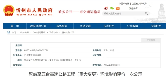 繁峙至五臺高速公路工程項目于2023年2月8日獲得忻州市行政審批服務管理局批復(忻審管生態(tài)函〔2023〕14號),批復工程為:路線全長64.357km,采用雙向四車道高速公路技術標準建設,設計速度100km/h,路基寬度為26m。共設特大橋6999m/4座、大橋4153m/14座、中橋880m/12座;特長隧道19785m/2座、長隧道1045m/1座、短隧道2475m/4座;互通式立體交叉4處(互通3處,樞紐1處),天橋11處;涵洞97道、通道23道,全線設置服務區(qū)1處,匝道收費站3處。項目尚未開工建設。
