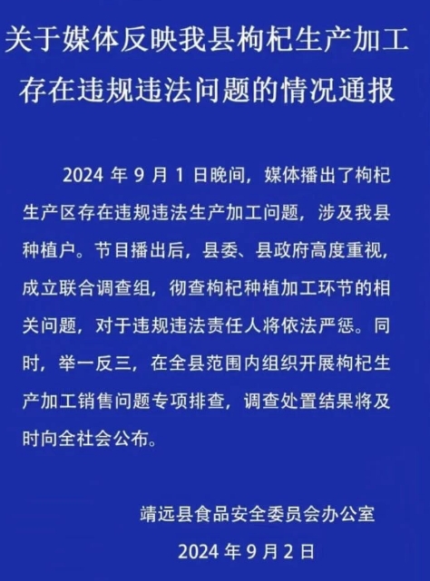 節(jié)目播出后,縣委、縣政府高度重視,成立聯(lián)合調(diào)查組,徹查枸杞種植加工環(huán)節(jié)的相關(guān)問題,對于違規(guī)違法責(zé)任人將依法嚴(yán)懲。