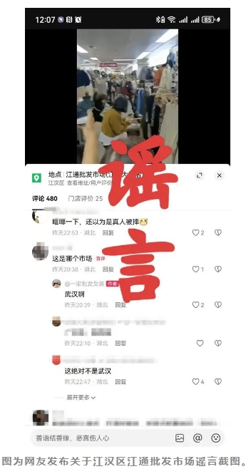 圖為網(wǎng)友發(fā)布關(guān)于江漢區(qū)江通批發(fā)市場謠言截圖。