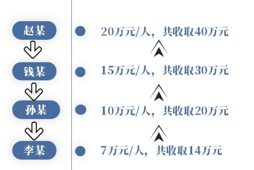 2020年12月,本案被害人小葉、小花(化名)兩兄妹經(jīng)人介紹來(lái)到“小腳丫”公益服務(wù)中心向趙某詢問(wèn)是否可以安排輔警工作。趙某了解二人學(xué)歷信息后,打電話詢問(wèn)錢某是否有關(guān)系可以安排輔警工作,錢某又見(jiàn)狀向朋友孫某打聽(tīng),孫某就此事詢問(wèn)李某,四人就這樣層層轉(zhuǎn)達(dá)、層層溝通。最后,李某答復(fù)其在市里有“關(guān)系”可以辦成這個(gè)事,但辦理輔警每人需要7萬(wàn)元費(fèi)用,還需按照正常報(bào)考流程考試后再找關(guān)系辦理,此消息便通過(guò)錢某、趙某層層轉(zhuǎn)達(dá)至兩兄妹,同時(shí)辦理輔警工作的7萬(wàn)元/人被層層加碼至10萬(wàn)元/人、15萬(wàn)元/人,20萬(wàn)元/人。之后,兩兄妹共支付40萬(wàn)元費(fèi)用給趙某,趙某拿到錢后自己截留10萬(wàn)元,將剩余30萬(wàn)元轉(zhuǎn)至錢某,錢某又截留10萬(wàn)元,將剩余20萬(wàn)元轉(zhuǎn)給孫某,孫某又截留6萬(wàn)元,將其余的14萬(wàn)元交給李某。
